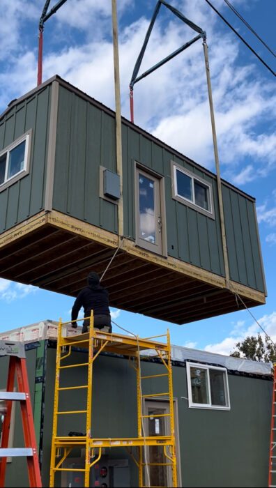 For this project both homes were built in our shop and then transported on site. From there they were removed from the trailer and craned onto a permanent foundation. The units were stacked. Each unit is completely stand alone and is a stacked duplex. We can use this method to configure homes in many different ways. Our imagination is the only thing that limits us.